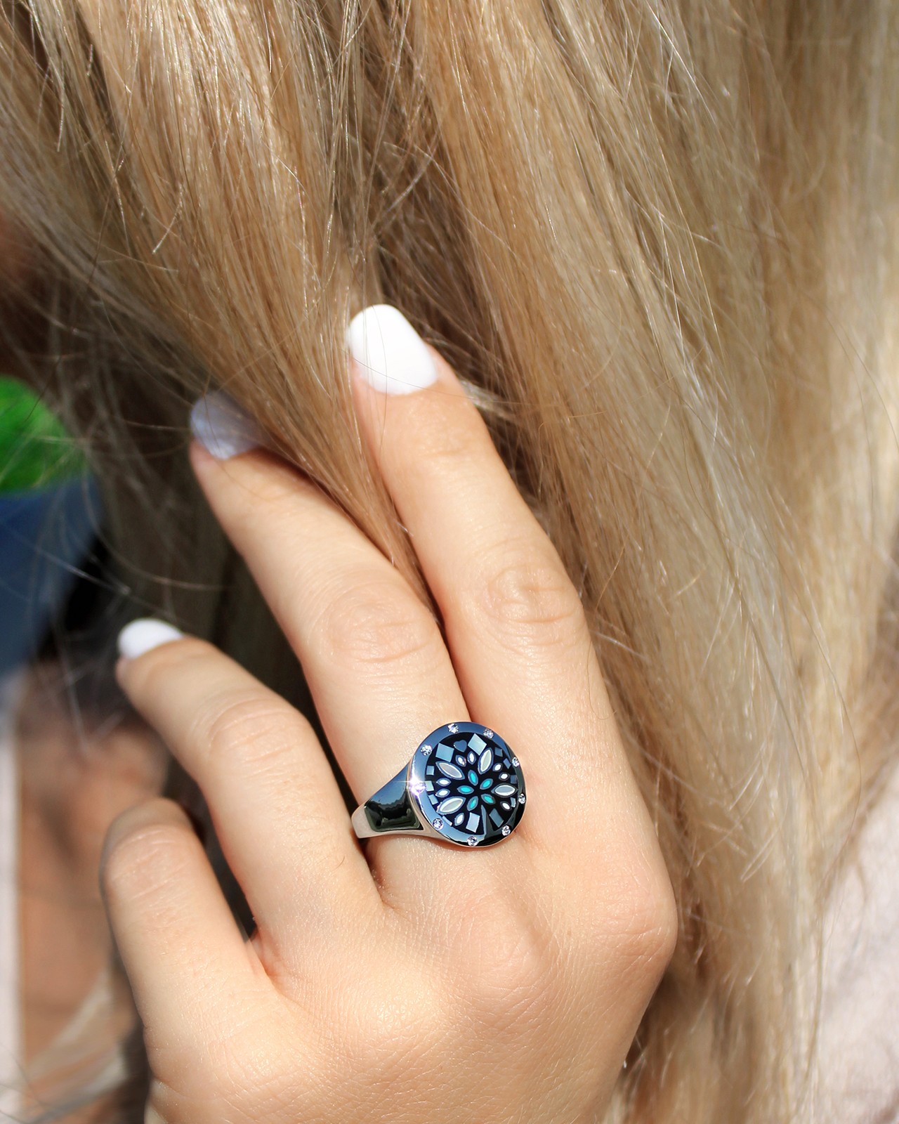 Sa forme chevalière et ses brillants viennent accentuer l'intensité de ce bijou.