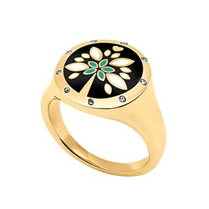 Sa forme chevalière épouse à la perfection son motif, contrasté par l'association de son noir intense et du rose gold de sa monture.