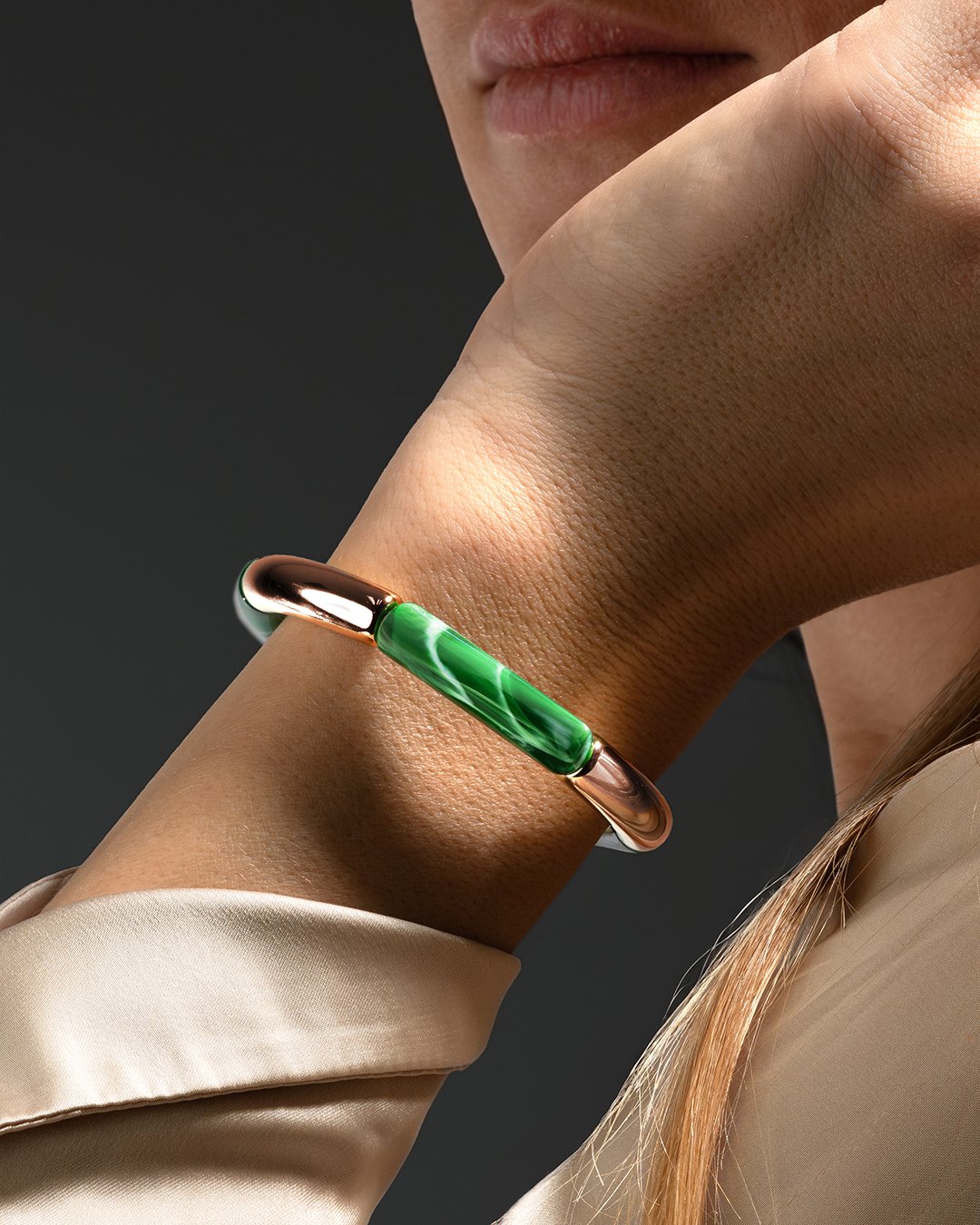 Il bracciale è composto da sei elementi raffinati: tre pezzi in acetato verde celadon marmorizzato, che donano un tocco sofisticato e naturale, e tre pezzi in acciaio rosa inossidabile, che uniscono robustezza e lucentezza. Il pezzo centrale, inciso a mano con il nome Anna Velazia, sottolinea l'esclusività e l'autenticità di questa creazione.