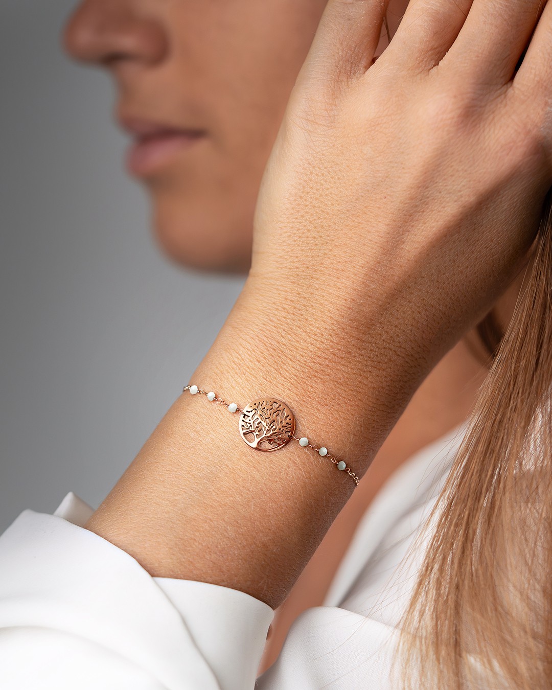Il bracciale Alcato si distingue per una catena elegante ornata da sei piccole pietre sfaccettate in howlite, che mettono in risalto un albero della vita al centro.