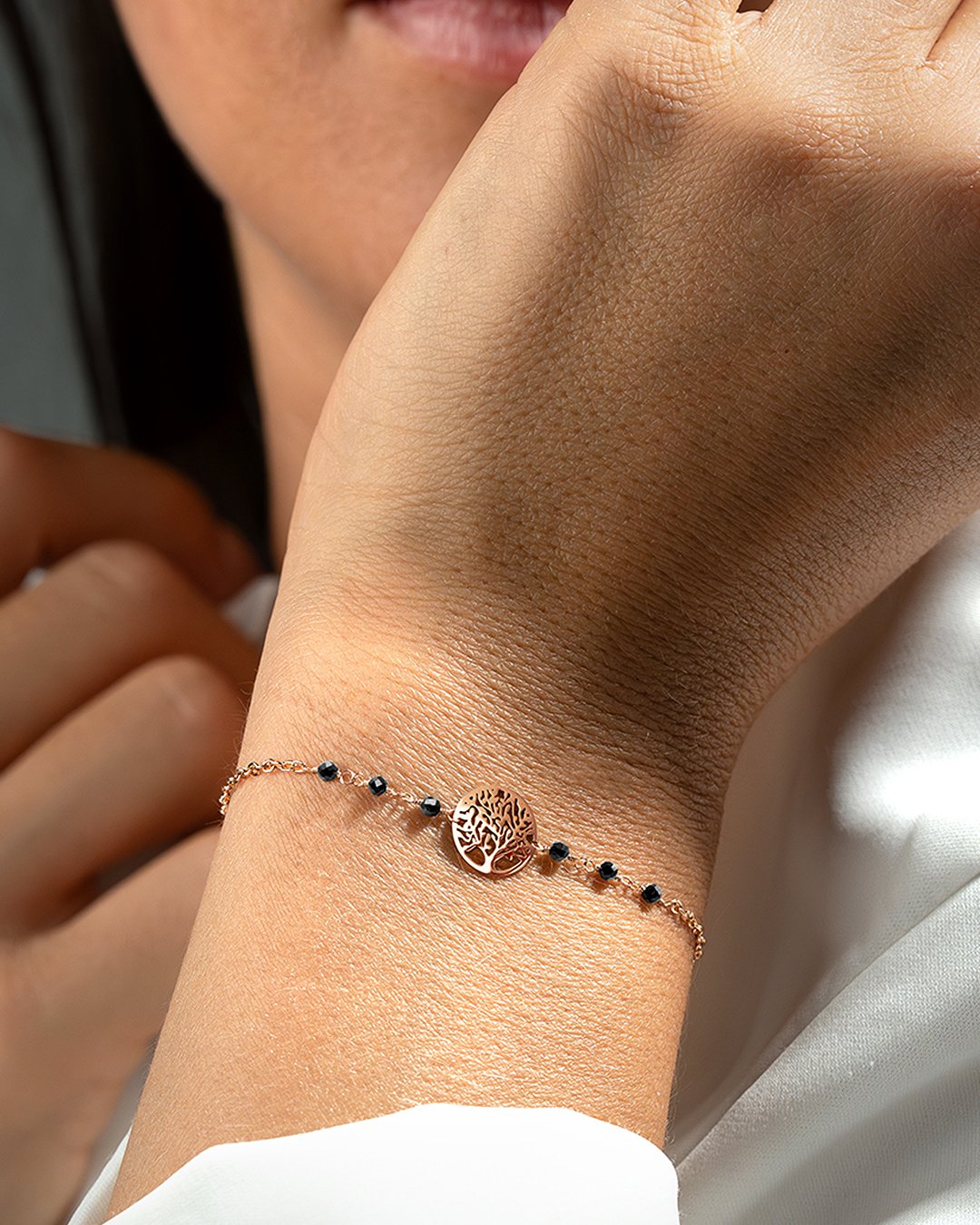 Il bracciale Leoneti si distingue per una catena elegante ornata da sei piccole pietre sfaccettate in Tormalina nera, che mettono in risalto un albero della vita al centro.