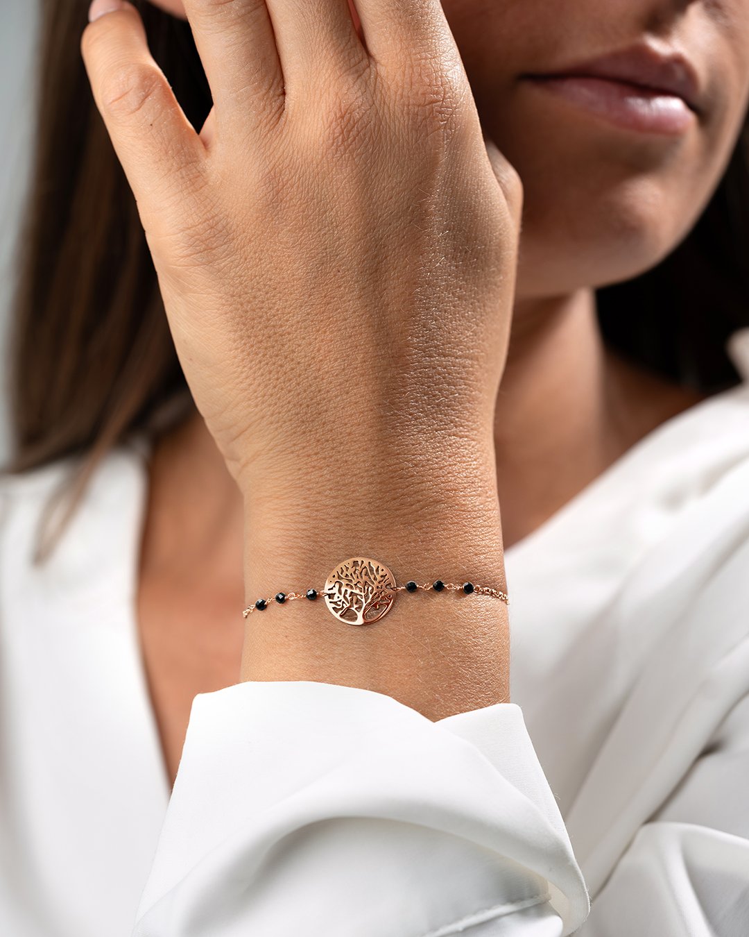 Il bracciale Leoneto si caratterizza per una catena elegante ornata da sei piccole pietre sfaccettate in tormalina nera, mettendo in risalto un albero della vita al suo centro.