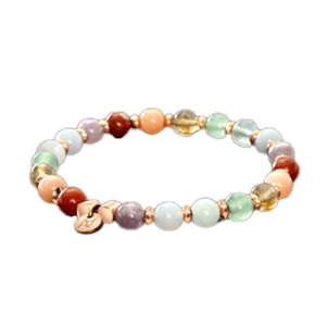 Questo gioiello associa una selezione completa di pietre naturali, creando una palette di colori armoniosa ed equilibrata. L'Ametista lavanda offre una delicata tonalità lilla, mentre il Calcedonio si distingue per il suo aspetto blu-grigio latteo. L'Acquamarina apporta un tocco di blu pallido e cristallino, seguita dall'Avventurina e dal suo verde tenero, a volte delicatamente luccicante. Il Citrino illumina la composizione con il suo colore giallo dorato trasparente, e la Pietra del sole si distingue per il suo scintillio unico, un effetto luccicante naturale. Infine, il Diaspro rosso ancora l'insieme con la sua tonalità terrosa e opaca.