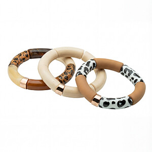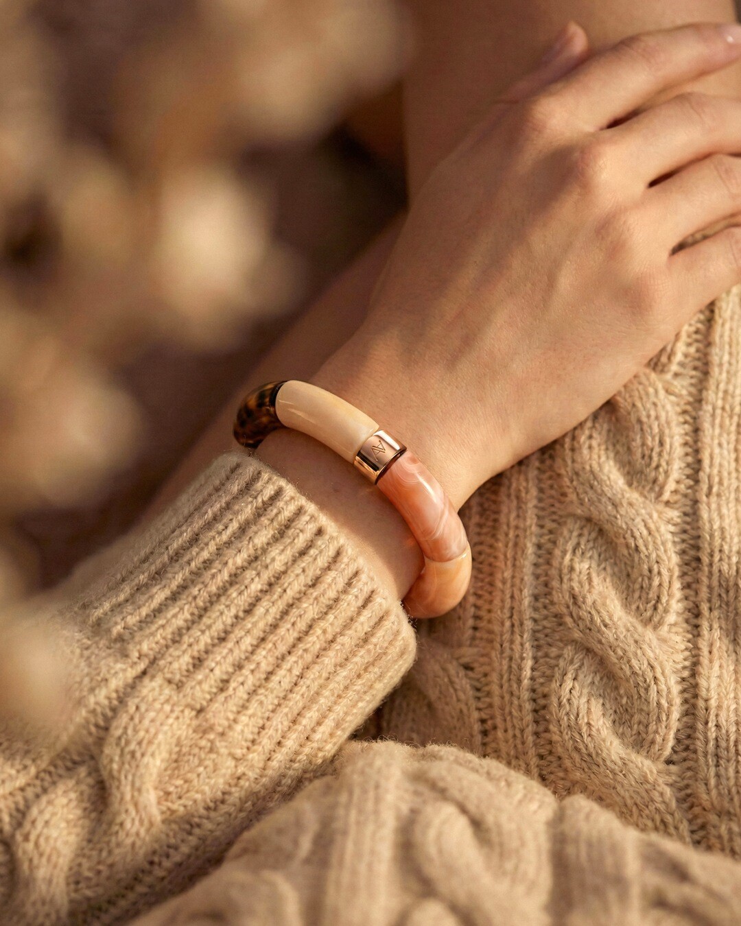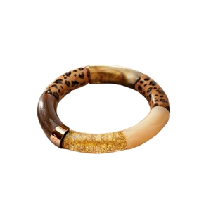 Il bracciale è composto da elementi raffinati nel colore Beige marmorizzato, Marrone leopardato trasparente, Beige albicocca opaco, Beige marmorizzato scuro, Salmone marmorizzato scuro.