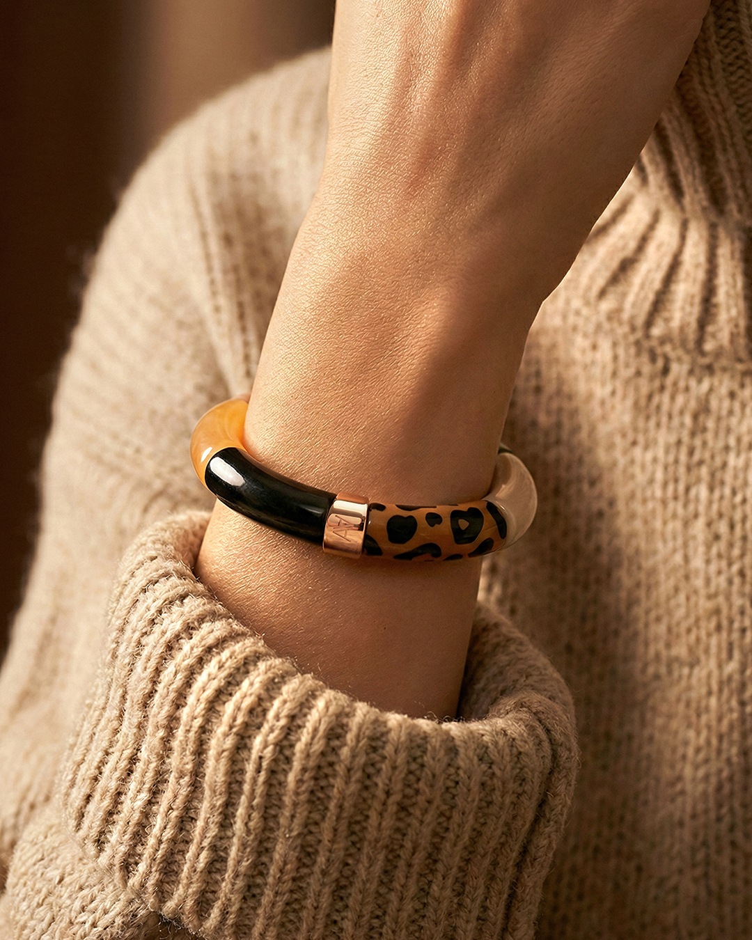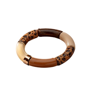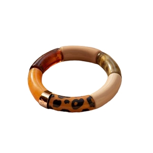 Il bracciale è composto da elementi raffinati nel colore Nero, Arancione ramato, Cammello opaco, Verde marmorizzato scuro, Beige latte, Marrone leopardato.