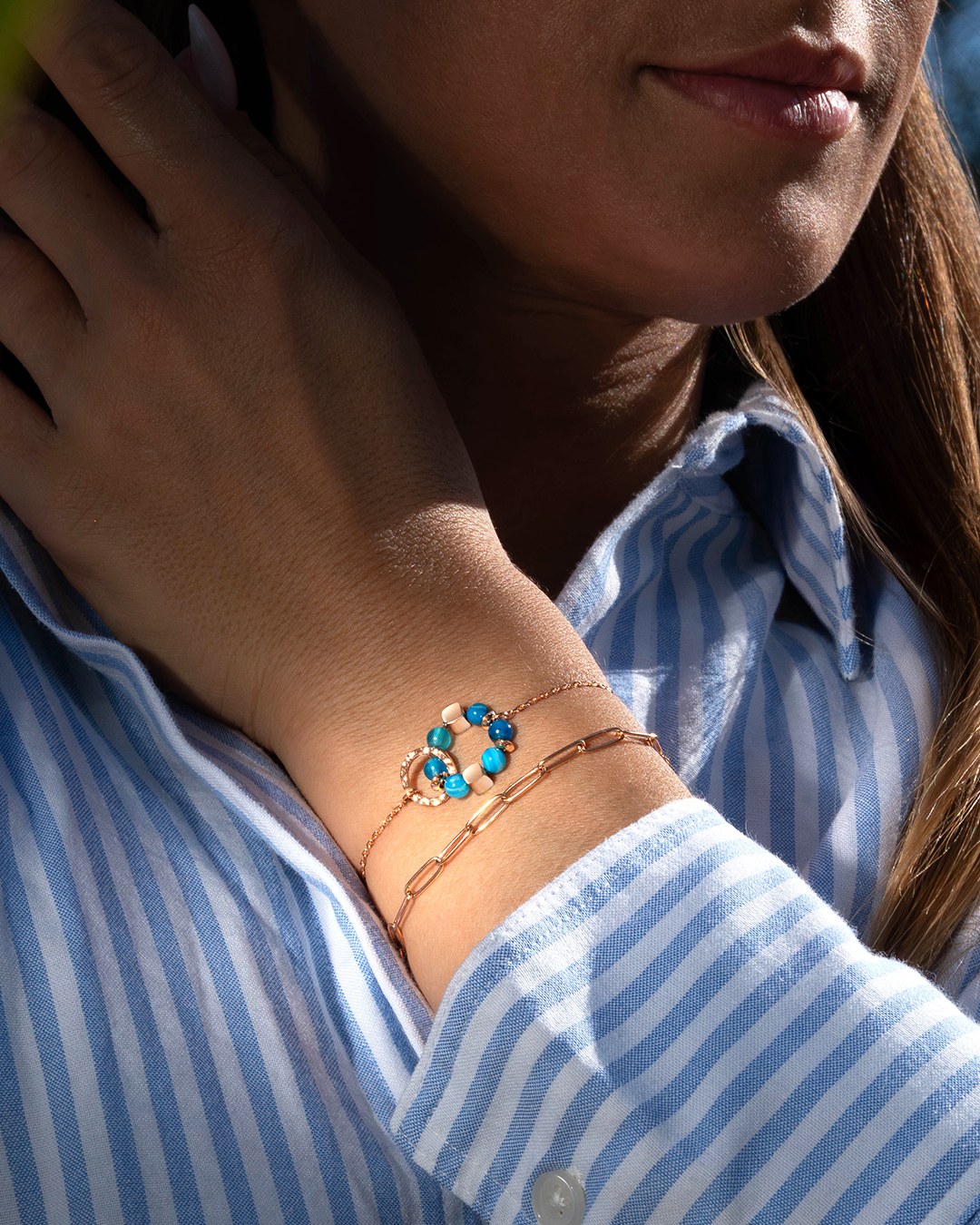 Il bracciale Azzurra è composto da una delicata catena in acciaio inox rosato, impreziosita al centro da un motivo floreale in Agata blu, intrecciato con un anello martellato in acciaio rosato.