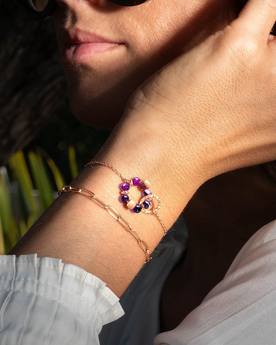 Il bracciale Porpora è composto da una delicata catena in acciaio inox rosato, impreziosita al centro da un motivo floreale in Agata viola, intrecciato con un anello martellato in acciaio rosato.
