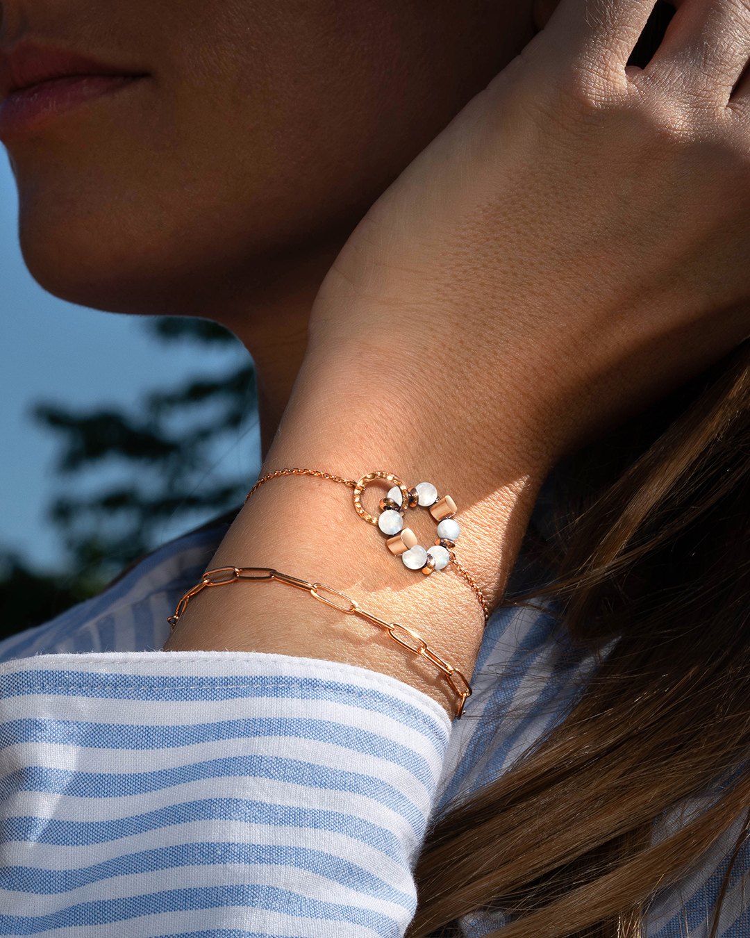 Il bracciale Selena è composto da una delicata catena in acciaio inox rosato, impreziosita al centro da un motivo floreale in Pietra di Luna, intrecciato con un anello martellato in acciaio rosato.