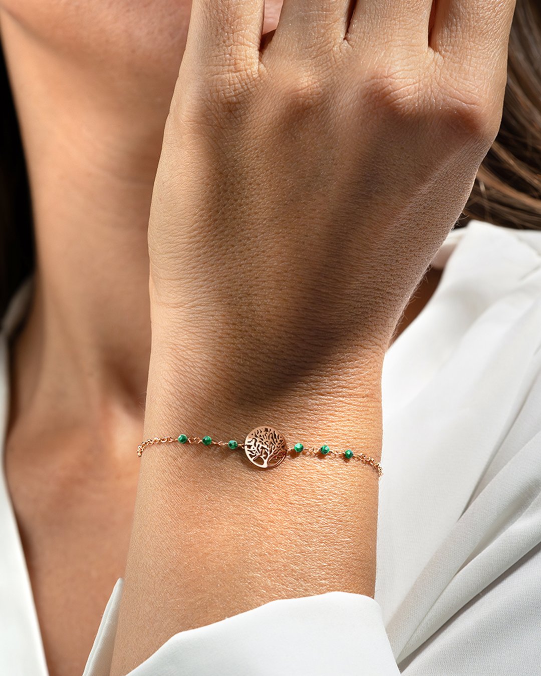 Il bracciale Venoti si distingue per una catena elegante ornata da sei piccole pietre sfaccettate in malachite, mettendo in risalto un albero della vita al centro.