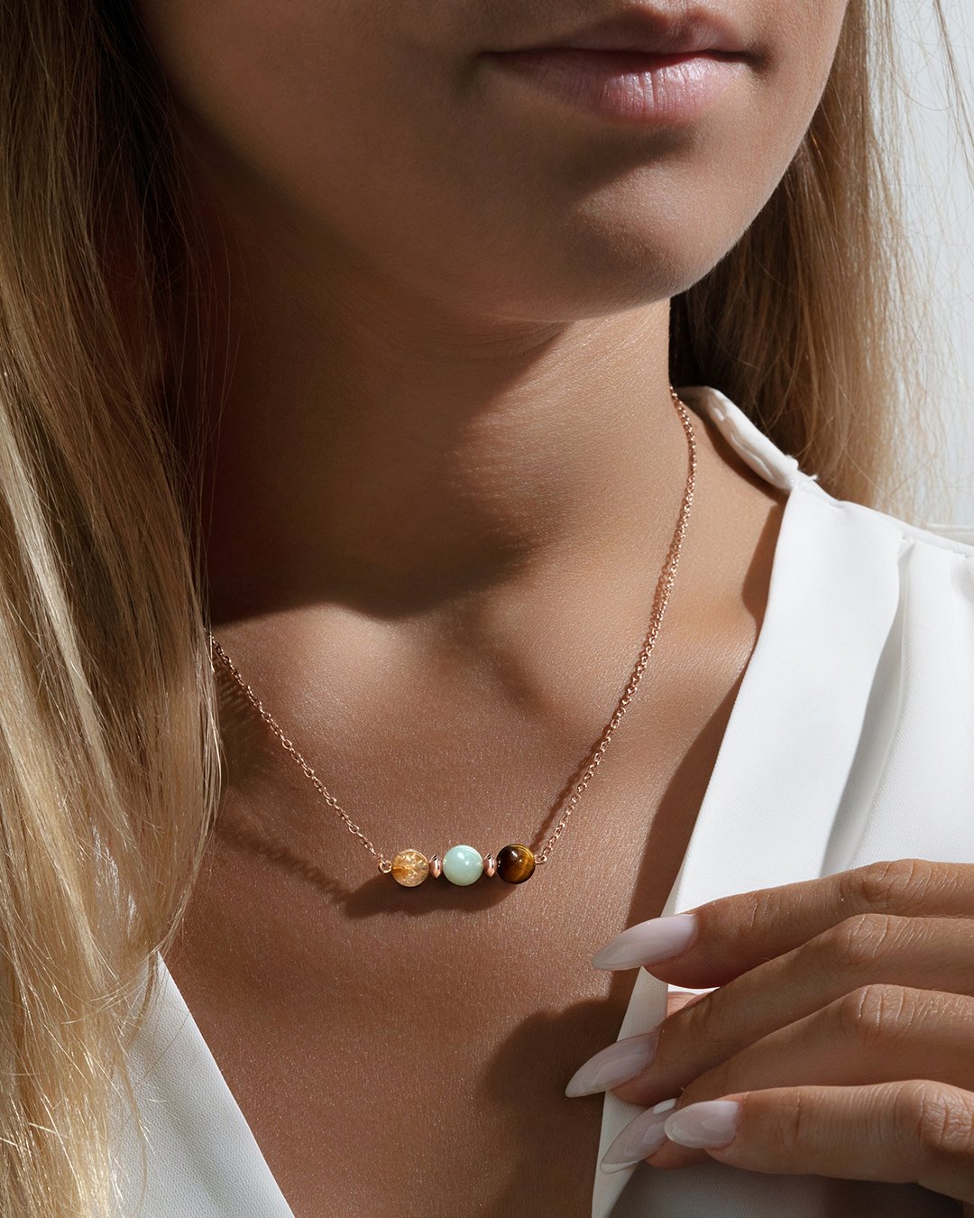 L'unione armoniosa della Citrina riscaldata, dell'Amazonite e dell'Occhio di Tigre simboleggia un equilibrio emotivo, una fiducia in sé stessi rafforzata e una solida protezione spirituale.