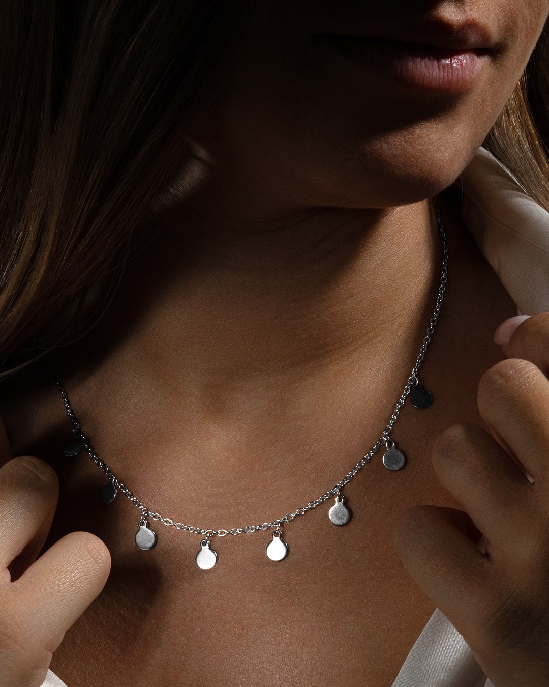 La collana Giulettana si caratterizza per una catena elegante ornata di delicate nappine, in acciaio inossidabile argentato.