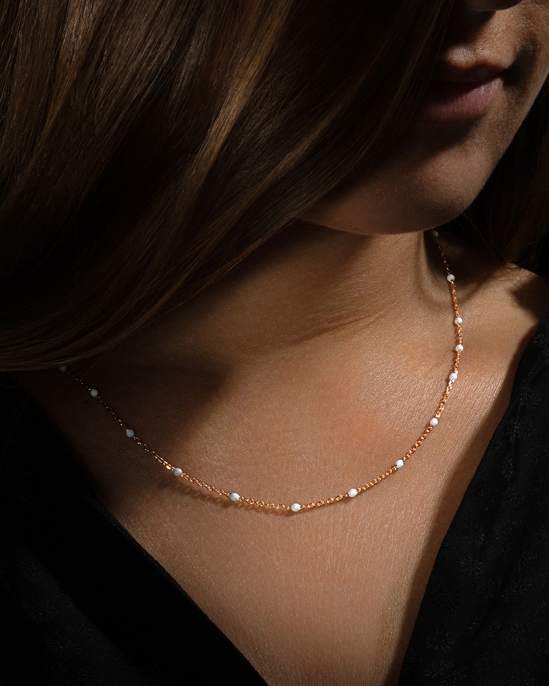 La collana Lenaya Rosa è composta da una catena in acciaio rosa inossidabile, arricchita da delicati ornamenti in smalto bianco.