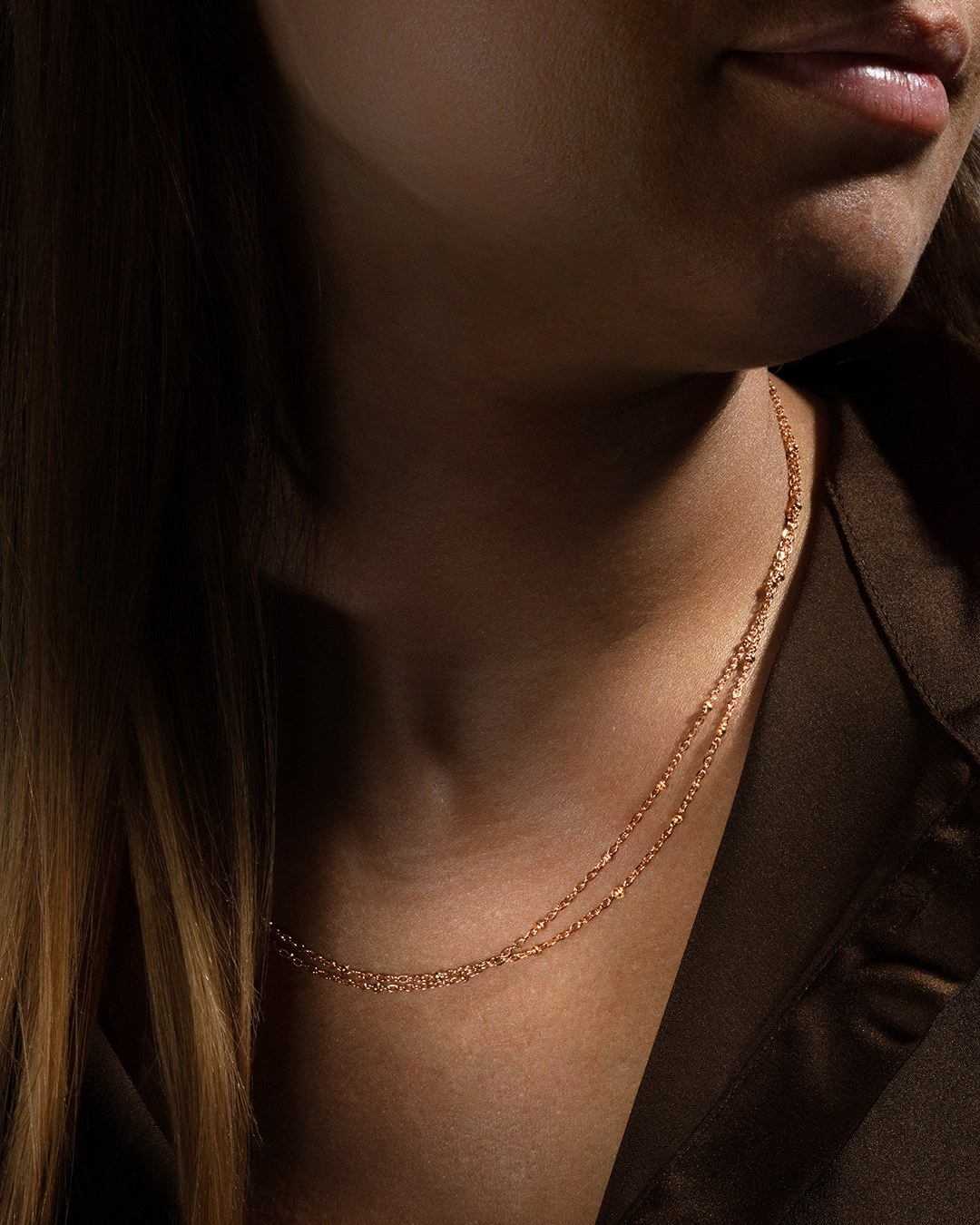 Questa collana ha una lunghezza totale di 50 cm, con una parte principale di 43 cm e una sezione regolabile di 7 cm, permettendo così di adattarsi a tutte le morfologie.