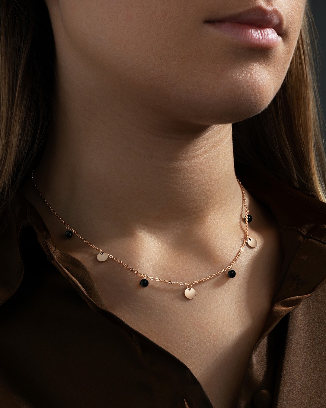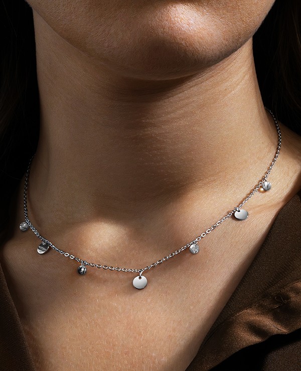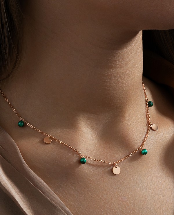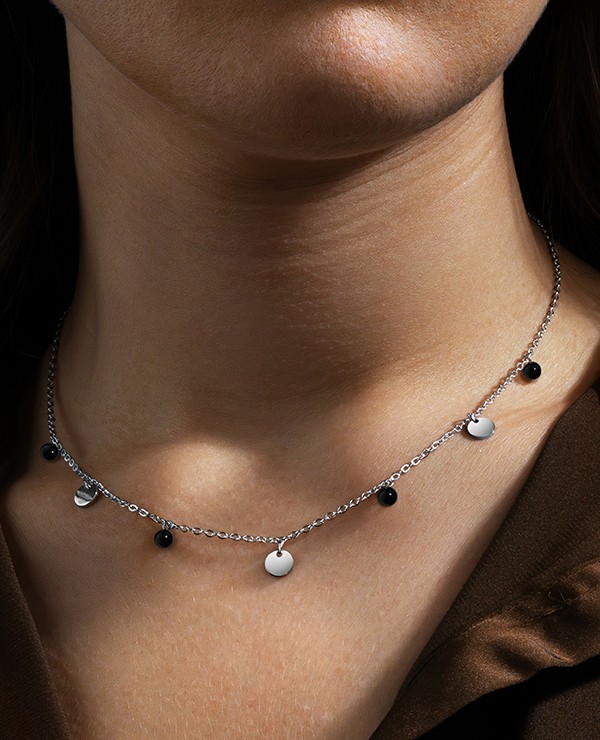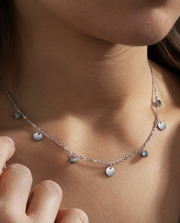 Misurando 48 cm di lunghezza con una parte regolabile di 6,5 cm, questo collier è progettato per adattarsi facilmente al tuo girocollo.