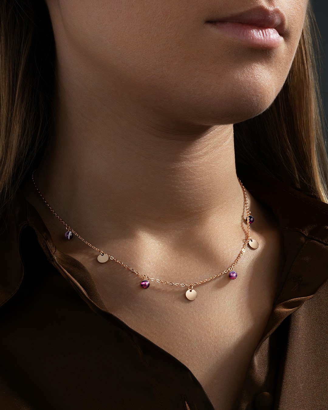 Il collier Calizzonotto mette in risalto 4 Agate viola striate, accuratamente disposte tra pendenti in acciaio rosa inossidabile, firmati Anna Velazia.